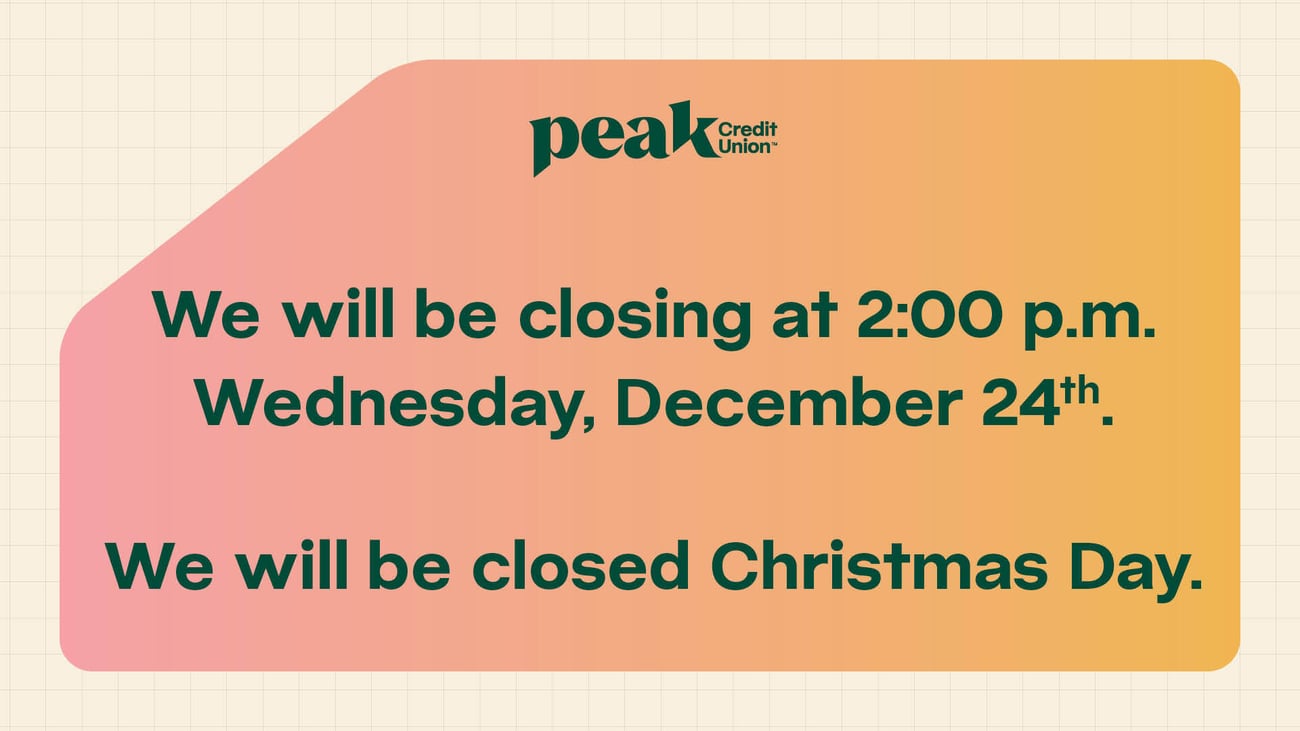 All branches and the Contact Center will be closing at 2:00PM Wednesday, December 24th. We will be closed on Christmas Day, December 25th. Normal hours will resume on Friday, December 26th.