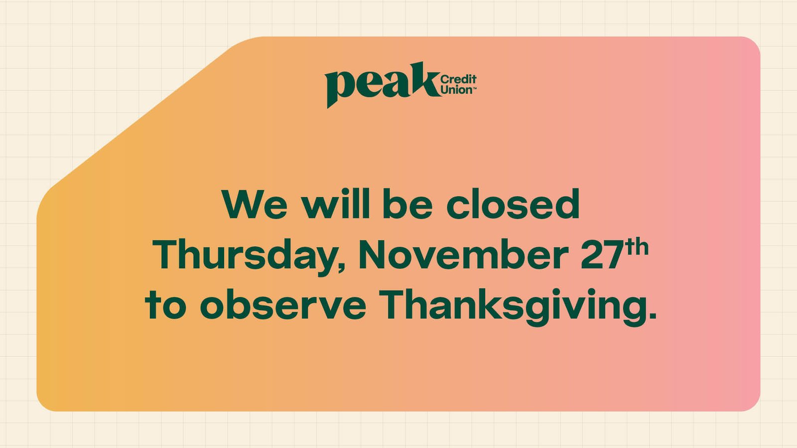 All branches and the Contact Center will be closed Thursday, November 27th in recognition of Thanksgiving. Normal hours will resume on Friday, November 28th with the exception of the Lacey Credit Union Center branch which will remain closed.
